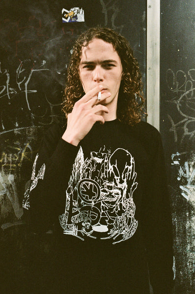 All cotton long sleeve t-shirt with screenprinted graphics. Original artworks by Carl Louie.